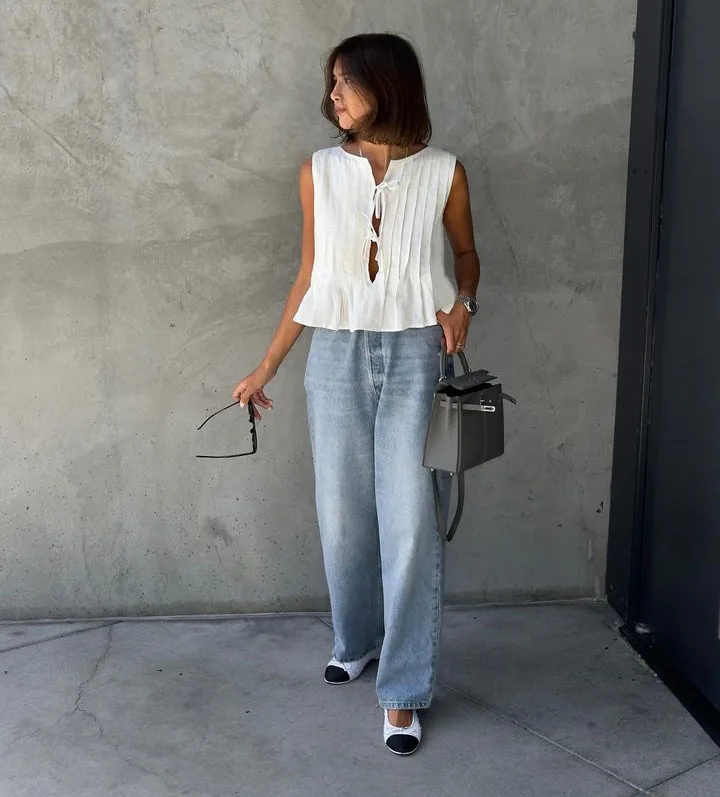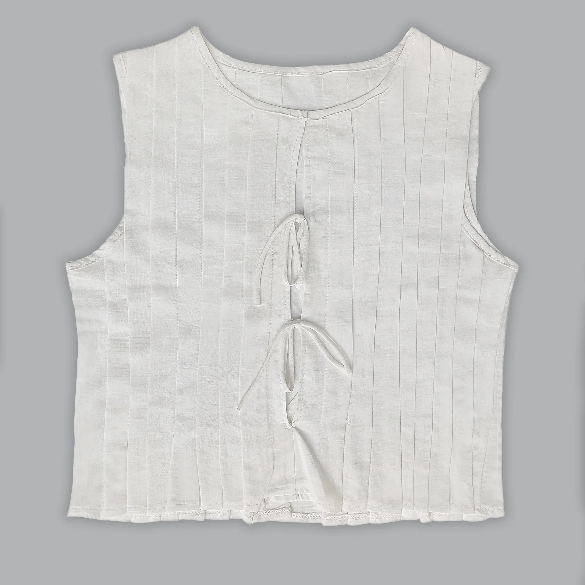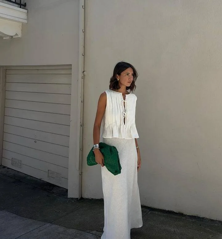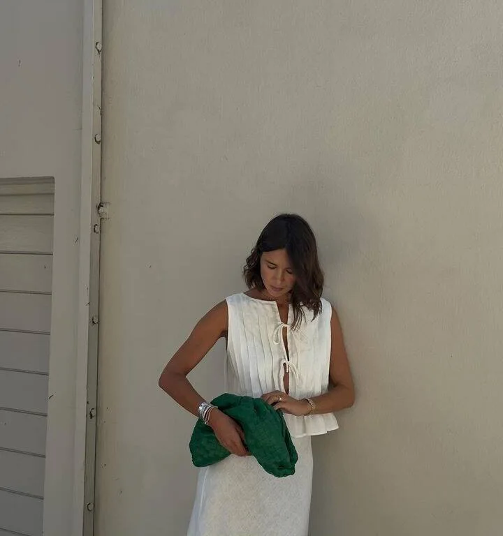 Uma peça delicada e cheia de personalidade, perfeita para quem busca leveza com um toque artesanal. A modelagem conta com plissados frontais estruturados que alongam a silhueta, enquanto a barra em babado fluido adiciona movimento e feminilidade. O destaque fica para os amarradinhos frontais, que criam uma abertura sutil e charmosa, trazendo um ar moderno ao visual.