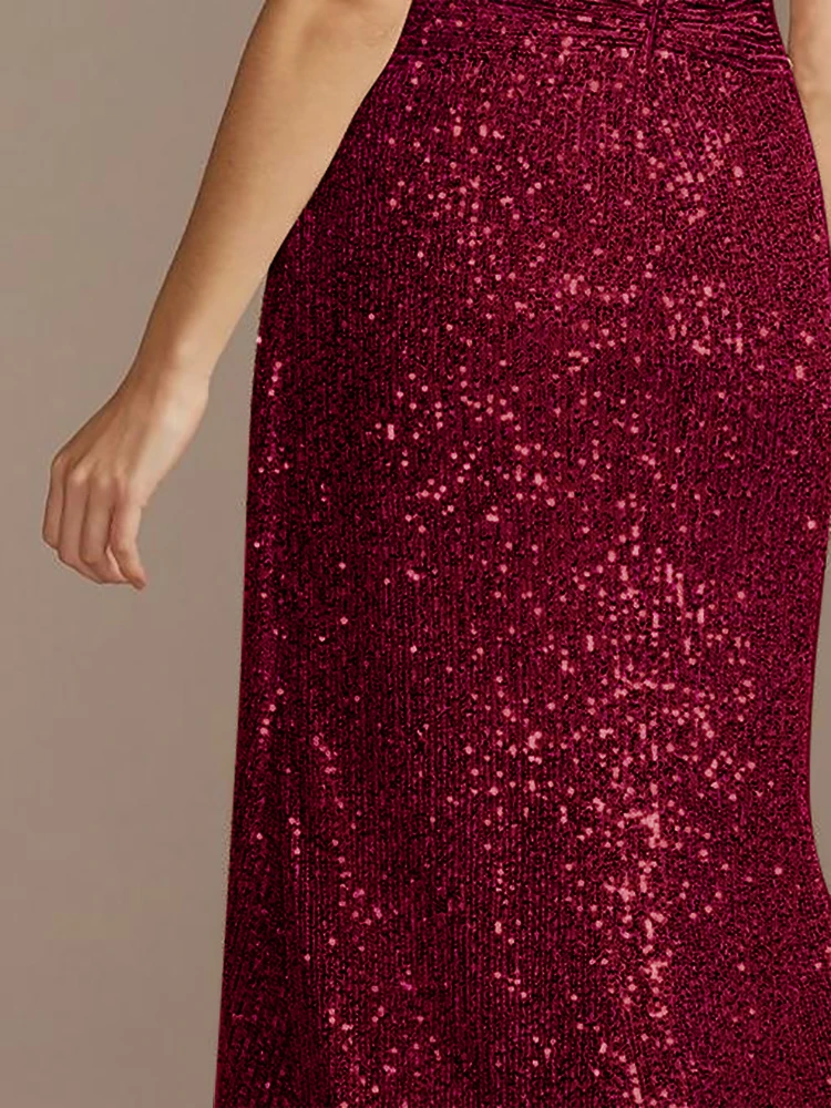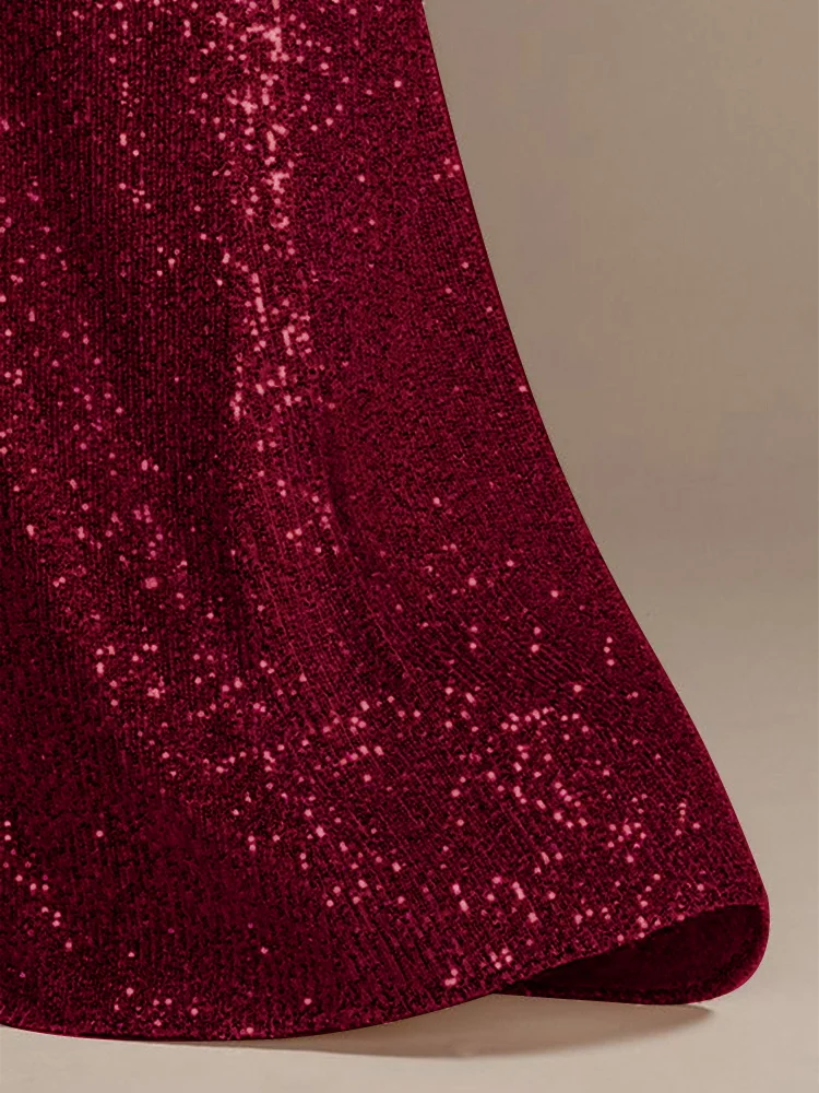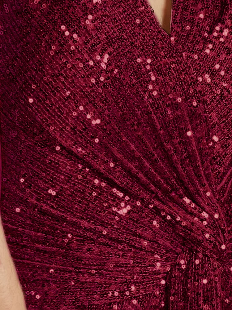 O vestido Maxi Luxo Vermelho combina brilho e elegância com seu tecido em paetê (sequin), decote V e silhueta trumpet/mermaid, que valoriza o corpo com sofisticação. Produzido em poliéster com tecelagem tatting, oferece presença marcante para eventos formais.
