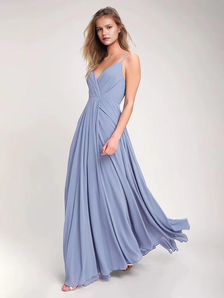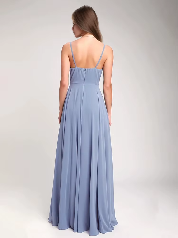 Elegante e atemporal, este vestido de noite em chiffon foi criado para quem busca leveza, movimento e presença em ocasiões especiais. O decote em V valoriza o colo com suavidade, enquanto a silhueta A-line alonga o corpo e garante um visual clássico, ideal para eventos formais.